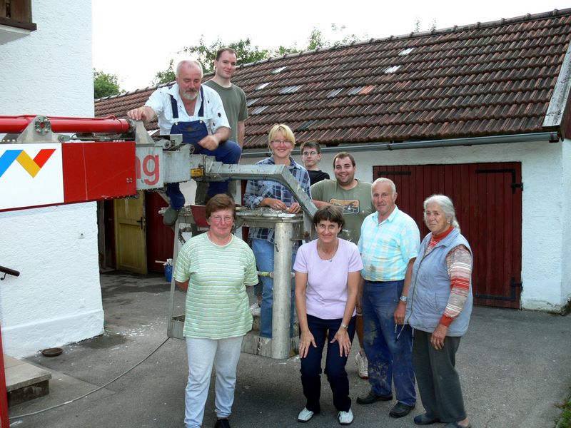 2007-06-01 Weisseln in Alzgern -- Norbert, Christian, Maria, Regina, Max, Marianne, Hans, Fridl und Oma Häring auf dem Hubsteiger nach getaner Arbeit