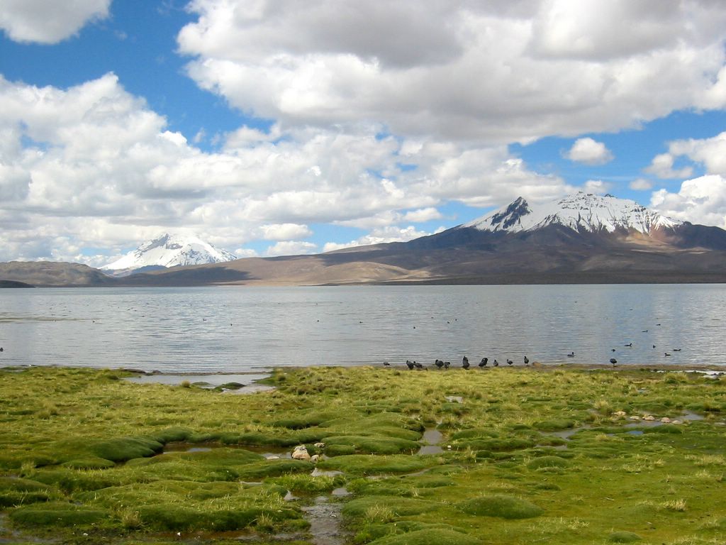 2006-03-14 Chile - Arica und Altiplano -- Lago Chungara mit Vulkanen im Hintergrund (Sajama und Quisi Quisini)