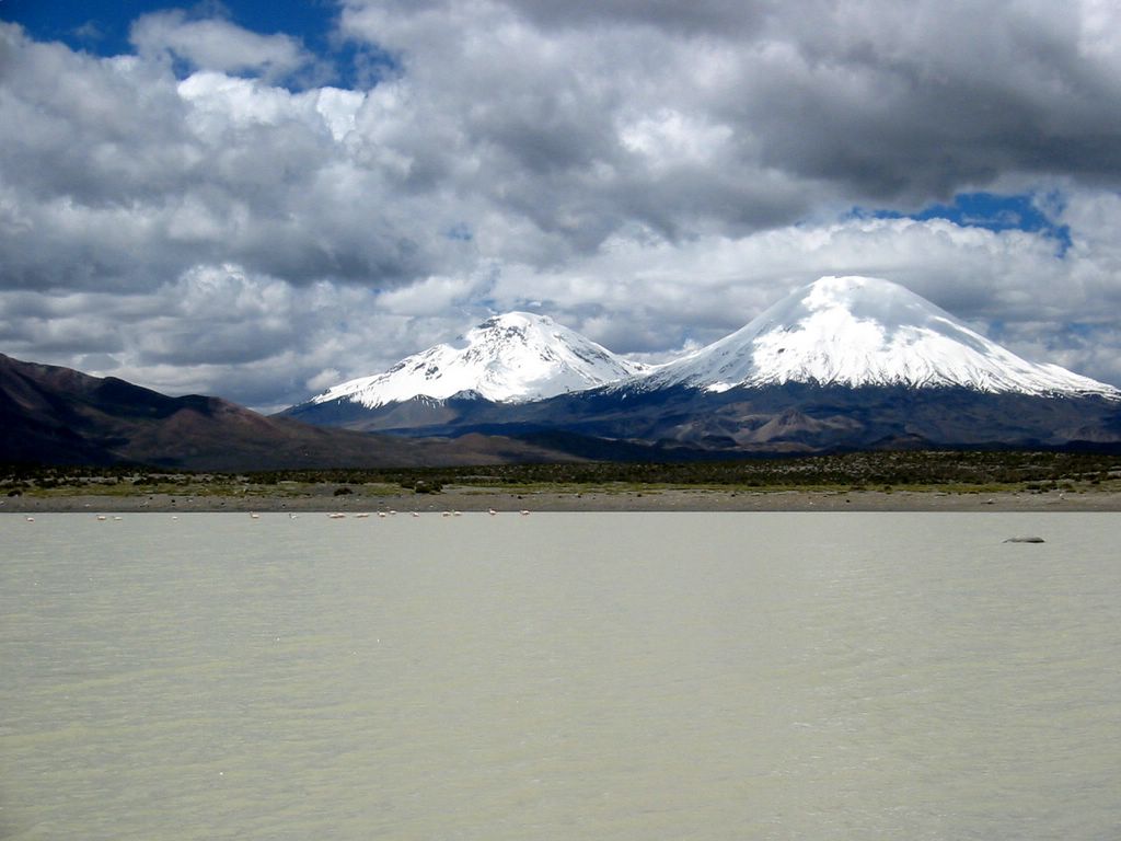 2006-03-14 Chile - Arica und Altiplano -- Lago Chungara mit Flamingos und Vulkanen (Pomerape und Parinacota)