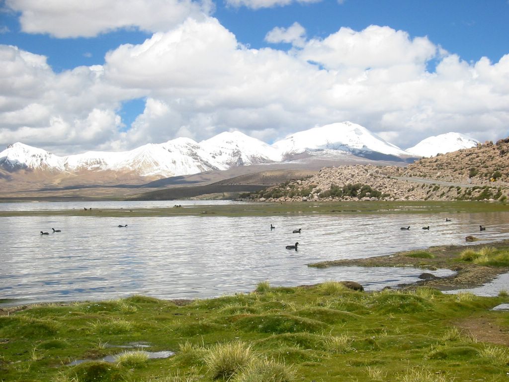 2006-03-14 Chile - Arica und Altiplano -- Lago Chungara mit Vulkanen im Hintergrund (Umurata, Quimsachata, Challacollo, Carbonire)