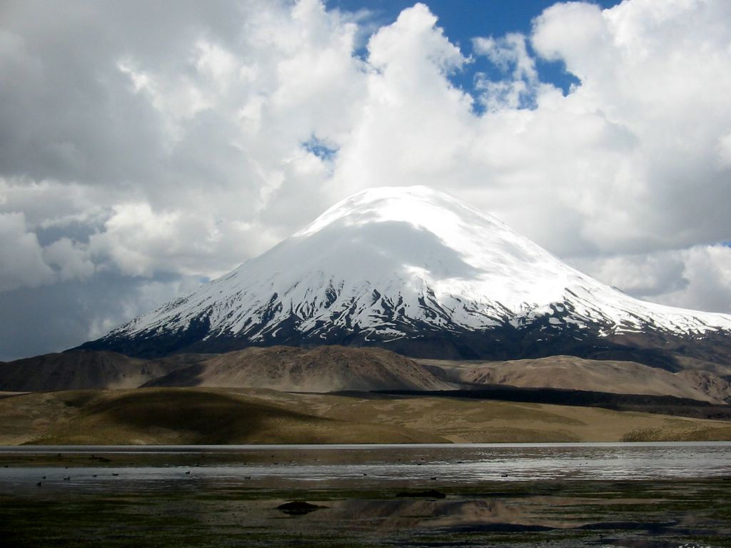 2006-03-14 Chile - Arica und Altiplano -- Lago Chungara mit Vulkanen im Hintergrund (Parinacota)